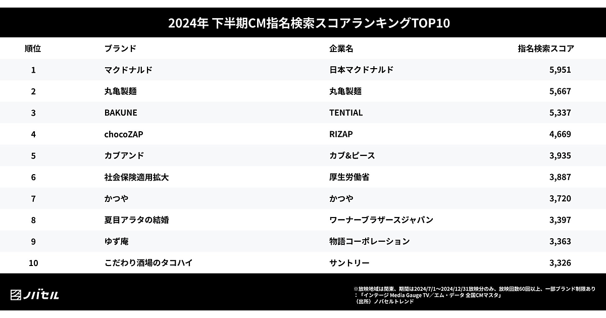 ノバセルは、テレビCM効果の分析サービス「ノバセル トレンド」を活用し、2024年下半期に放映されたテレビCMの指名検索スコアランキングを発表した。