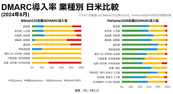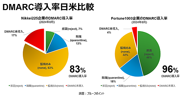 日本プルーフポイントは、日経225企業および米フォーチュン1000(Fortune 1000)企業を対象とした、DMARC導入状況の調査結果を公表(2024年9月)。それによると、日経225企業では83%が、Fortune 1000企業では96%がDMARCを導入していた。