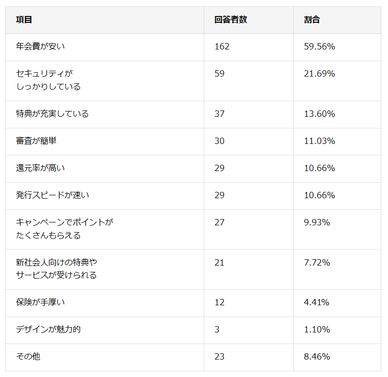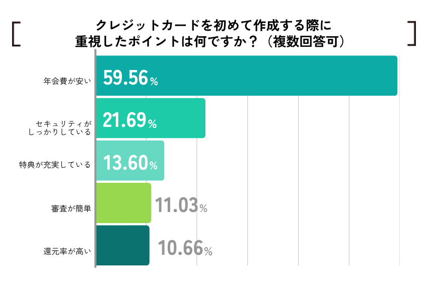 そして「クレジットカードを初めて作成する際に重視したポイント」を聞くと、「年会費が安い」59.56%が過半数で最多。「セキュリティがしっかりしている」21.69%、「特典が充実している」13.60%、「審査が簡単」11.03%、「還元率が高い」などを大きく上回っている。なお、こうしたポイントは年次で変化するものもあるため、「新社会人のときに作成したカードは現在も利用しているか?」については、「いいえ」52.94%、「はい」47.06%と半々に分かれた。