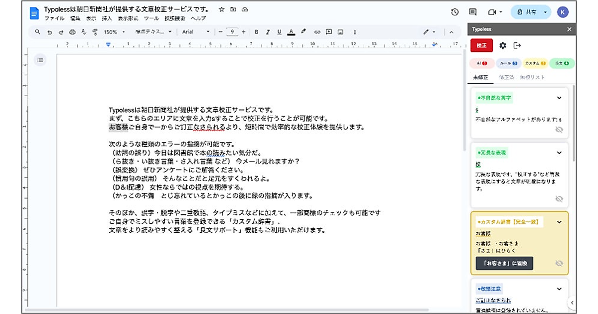 朝日新聞社は、同社が展開する文章校正AI(人工知能)「Typoless(タイポレス)」が、Googleの文書作成ソフト「Google Docs」のアドオンで利用できるようになった、と2月13日発表した。アドインとして使える「Microsoft Word」に加え、Google DocsでもTypolessを活用した効率的な文書作成が可能になった。これによる利用料金の変更はない。