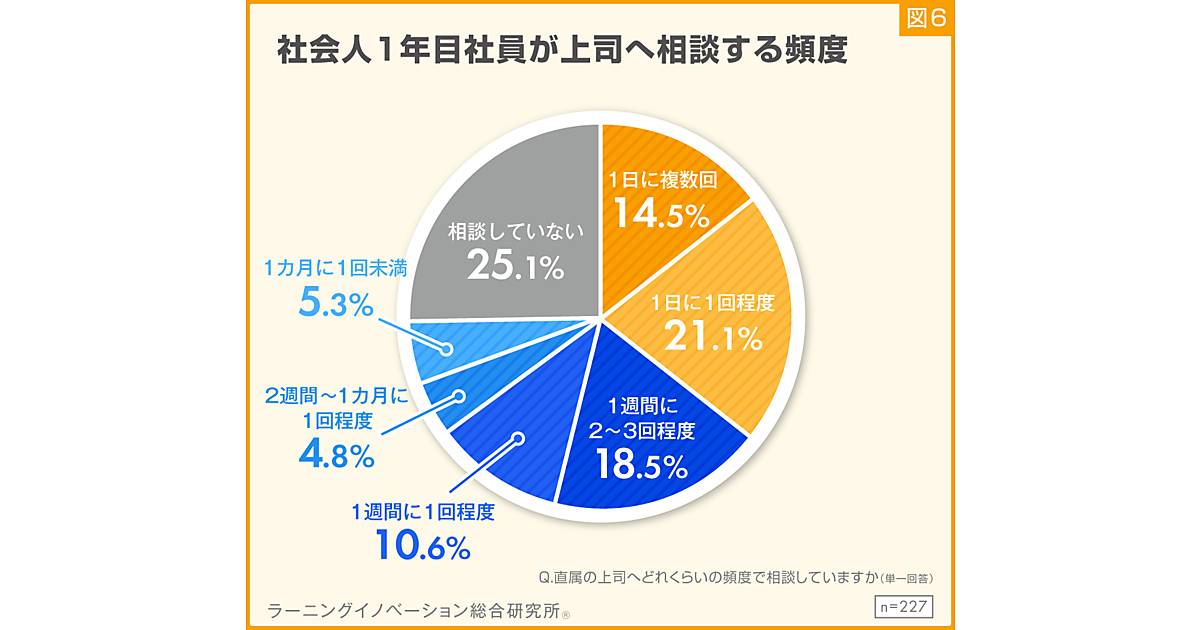 上司とコミュニケーションをとっていると回答した対象に、相談頻度を聞いたところ、最も高かった割合は「相談していない」で25.1%だった。次いで、「1日1回程度」が21.1%、「1週間に2~3回程度」が18.5%、「1日に複数回」が14.5%だった。