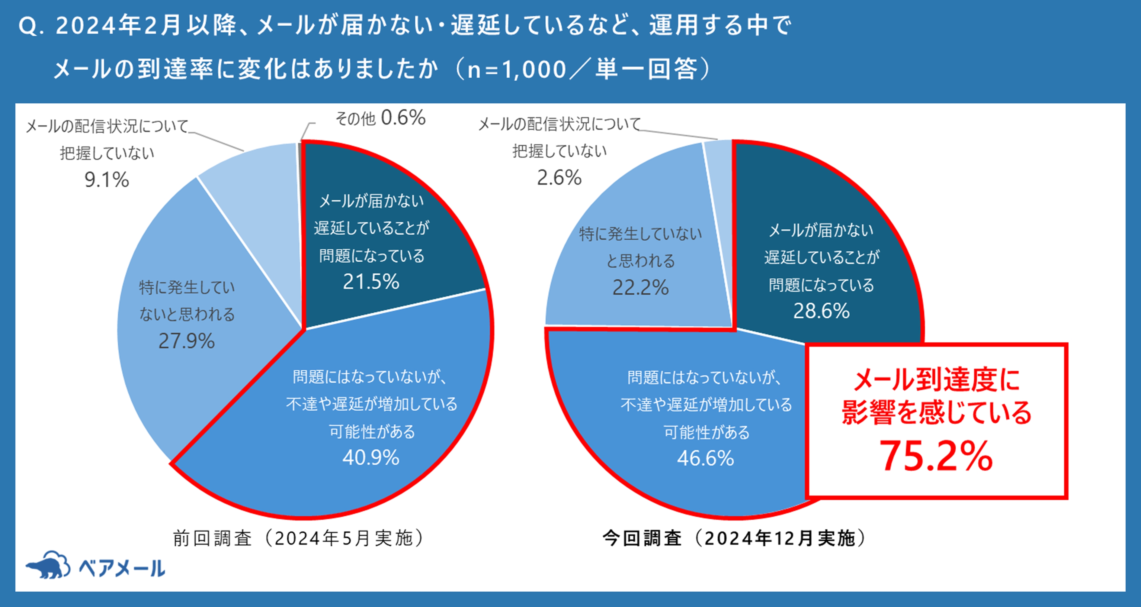 また「2024年2月以降、自社のメール配信において不達や遅延など配信状況に変化があったか」を聞くと、「届かない・遅延が問題になっている」28.6%、「問題にはなっていないが、不達や遅延が増加している可能性がある」46.6%と、計75.2%の企業が影響を感じていた。前回調査時(2024年5月)は、6割程度だったため、不達・遅延が以前よりも増えている可能性が考えられる。