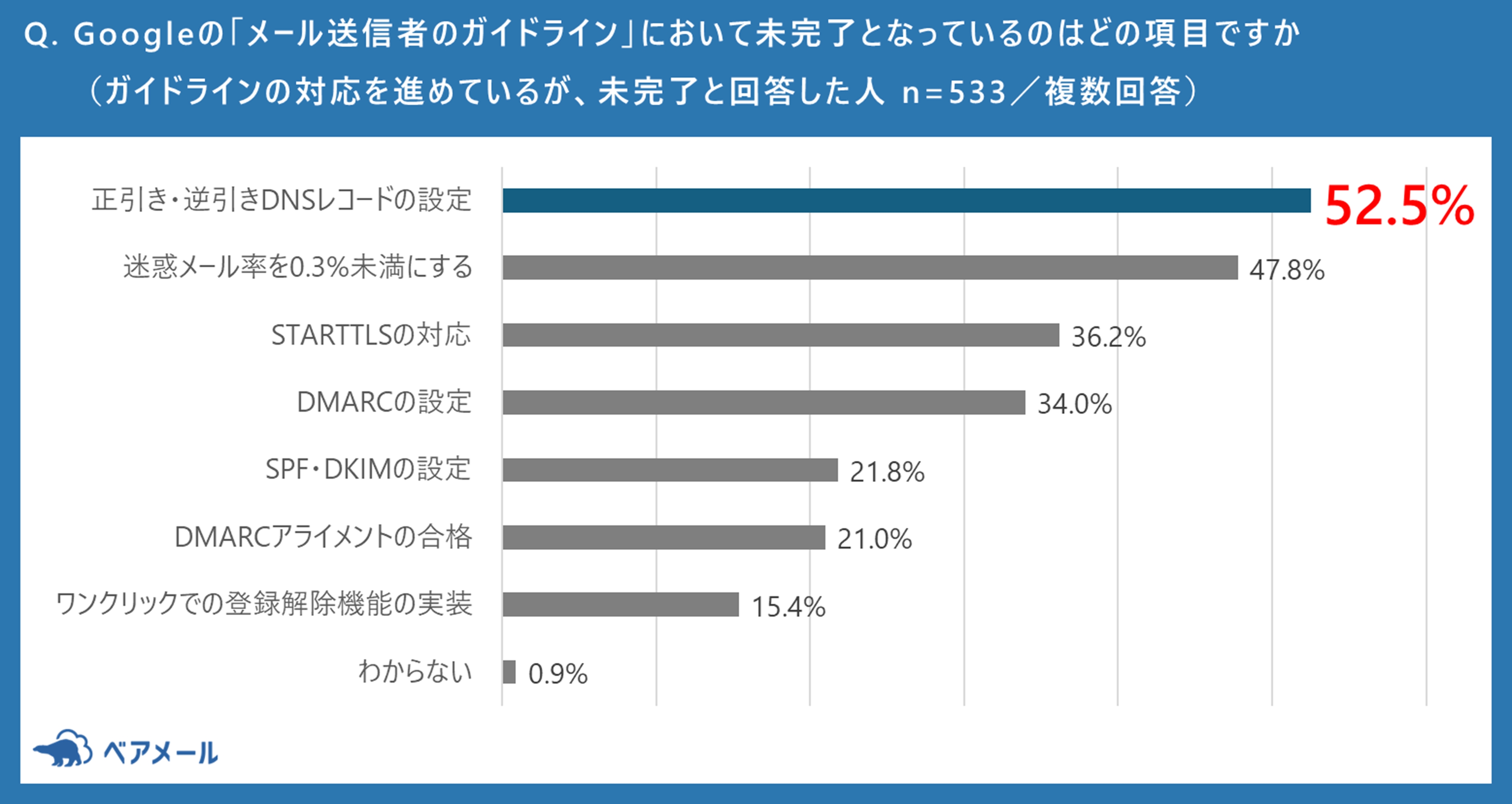 「ガイドライン対応の未完了になっている項目」について聞くと、前回調査時と変わらず「正引き・逆引きDNSレコードの設定」52.5%が最多で、「迷惑メール率を0.3%未満にする」47.8%がそれに続いた。