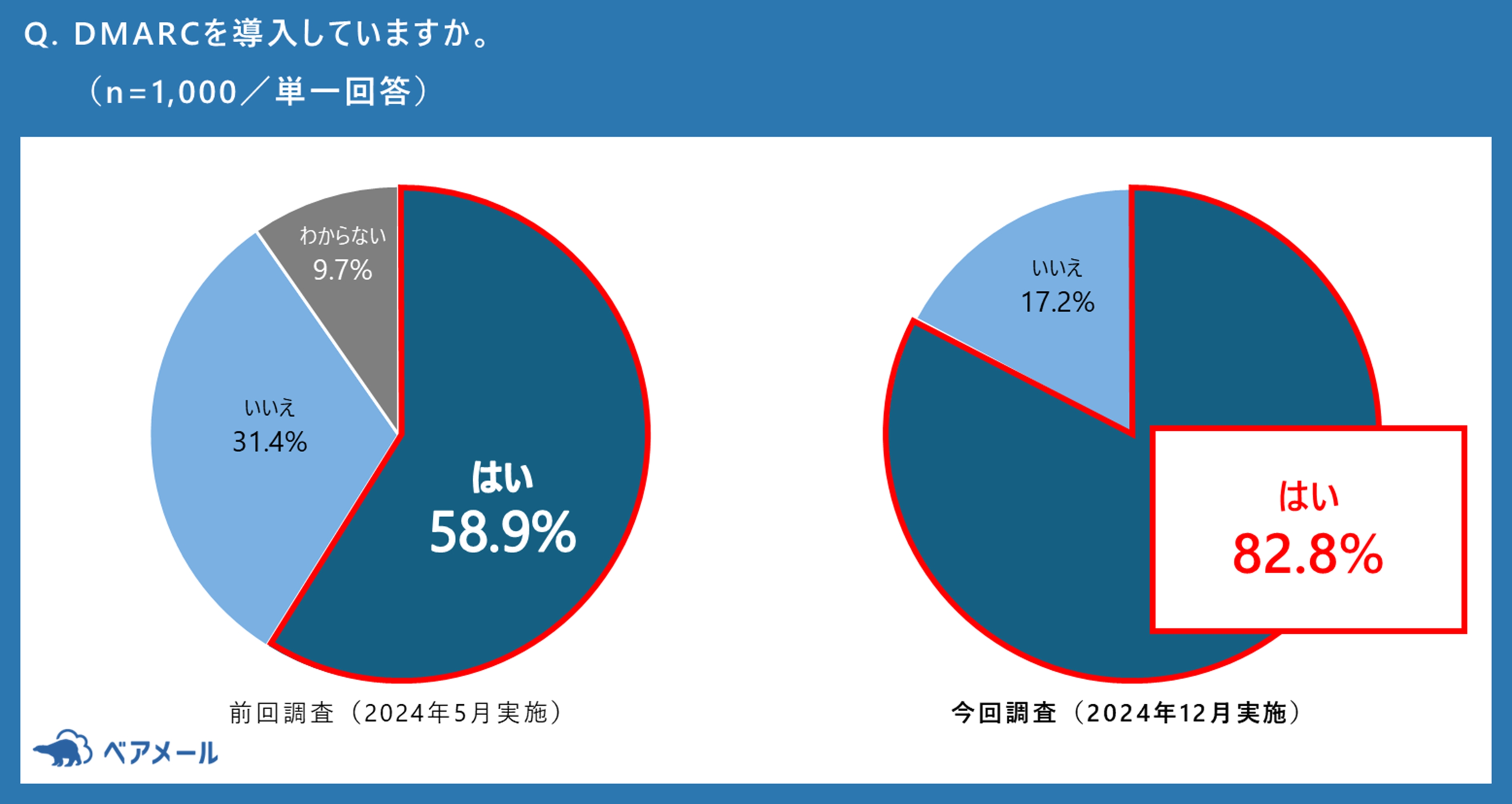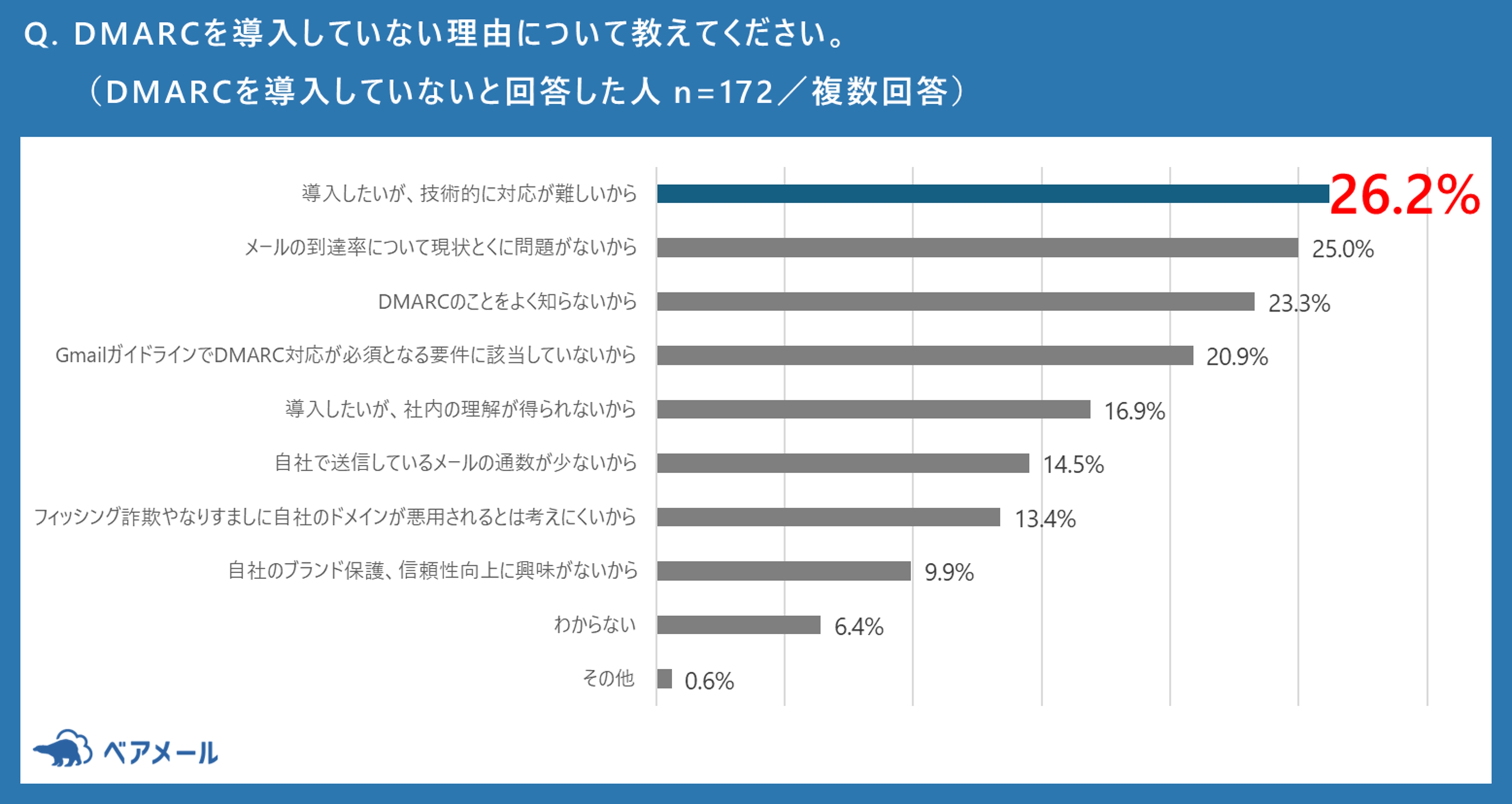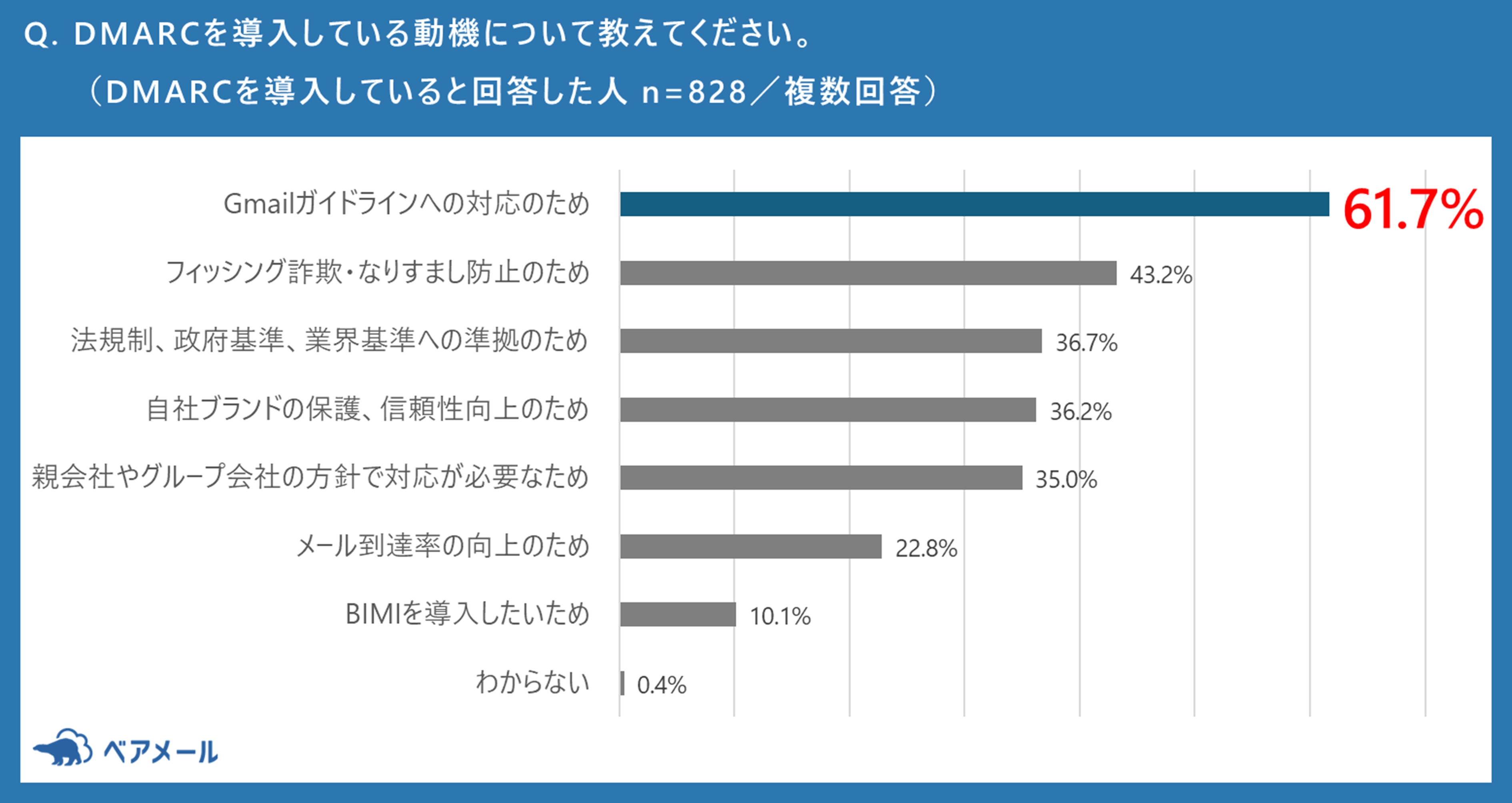 ガイドラインでは、1日5,000通以上Gmail宛に配信する送信者はDMARC対応が必須とされているが、「DMARCを導入している」との回答が、前回58.9%から今回は82.8%まで大きく上昇している。なおDMARCを導入した動機のトップは「Gmailガイドラインへの対応のため」61.7%、DMARCを導入していない理由のトップは「導入したいが、技術的に対応が難しいから」26.2%だった。