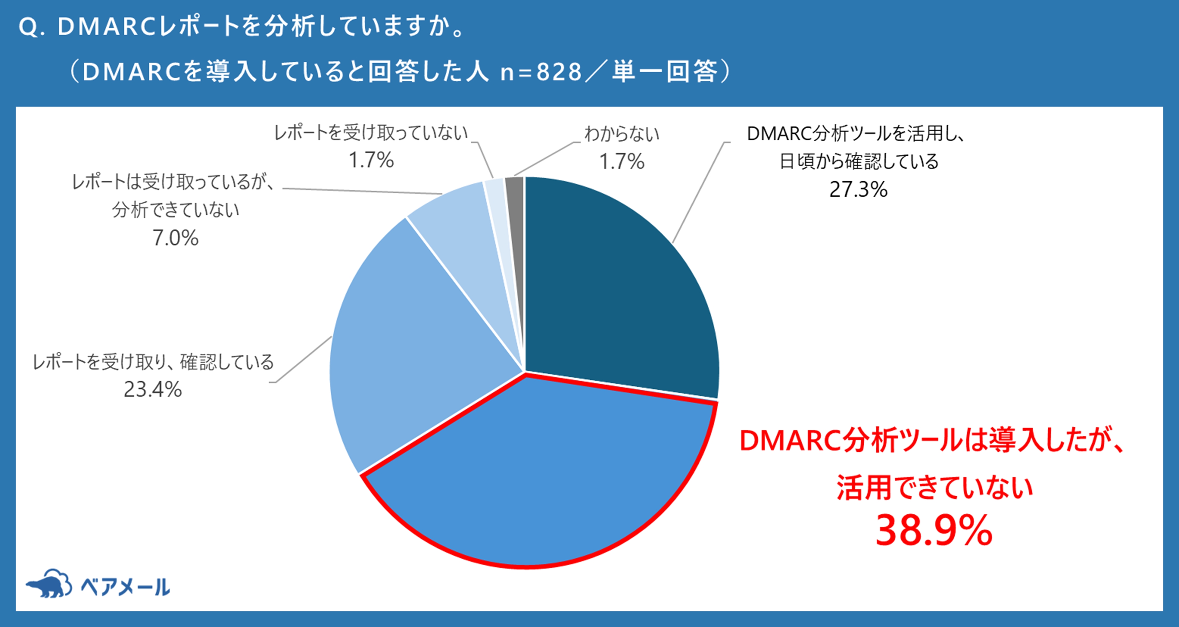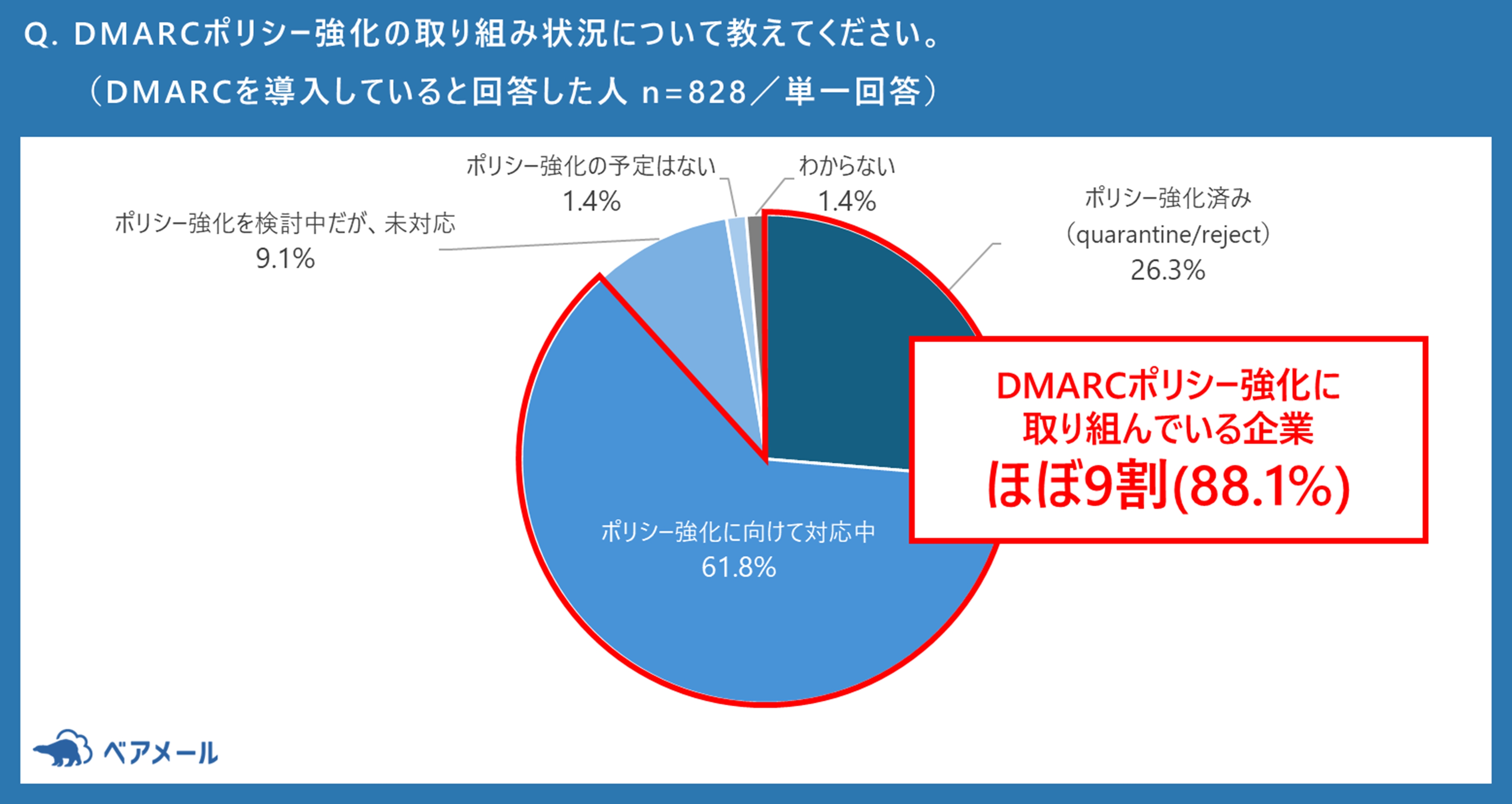 「DMARCの導入後、レポートの分析を行っているか」を聞くと、「DMARC分析ツールは導入したが、活用できていない」38.9%が最多。「DMARC分析ツールを活用し、日頃から確認している」27.3%がそれに続く。さらにDMARCを導入している回答者に対し「DMARCのポリシー強化の取り組み状況」を聞くと、「ポリシー強化に向けて対応中」61.8%、「ポリシー強化済み(quarantine/reject)」26.3%を合わせ、ほぼ9割の企業がポリシー強化に前向きに取り組んでいた。