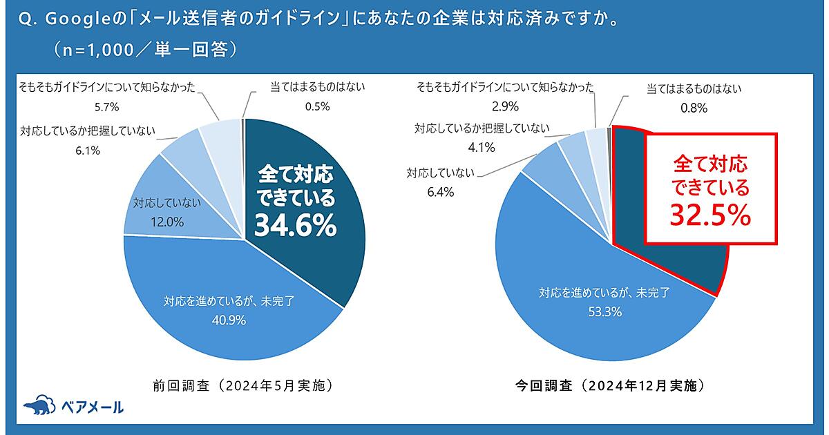 2024年2月にGmailの「メール送信者のガイドライン」が適用されてから1年が経過したが、「ガイドラインに全て対応できている」32.5%で、「対応は進めているが未完了」の割合が53.3%と半数を超える。