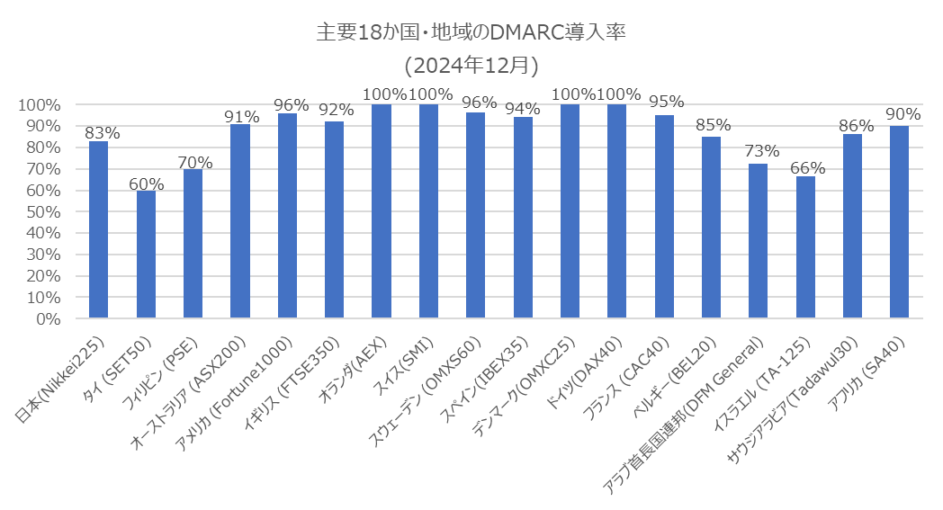 プルーフポイントが2024年12月に実施した調査によると、日経225企業のDMARC導入率は83%。17%が未導入であり、ドメインのなりすまし詐欺対策に着手していないことが判明した。オランダ、スイス、デンマーク、ドイツの4か国は、DMARC導入率は100%だった。