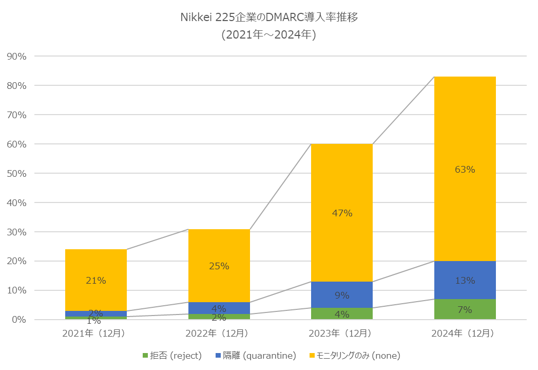 日経225企業におけるDMARC認証の導入率は、2023年に比べて20ポイント増加しているが、None(モニタリングのみ)が63%と最も多かった。RejectおよびQuarantineポリシーの導入拡大が今後の課題となるだろう。