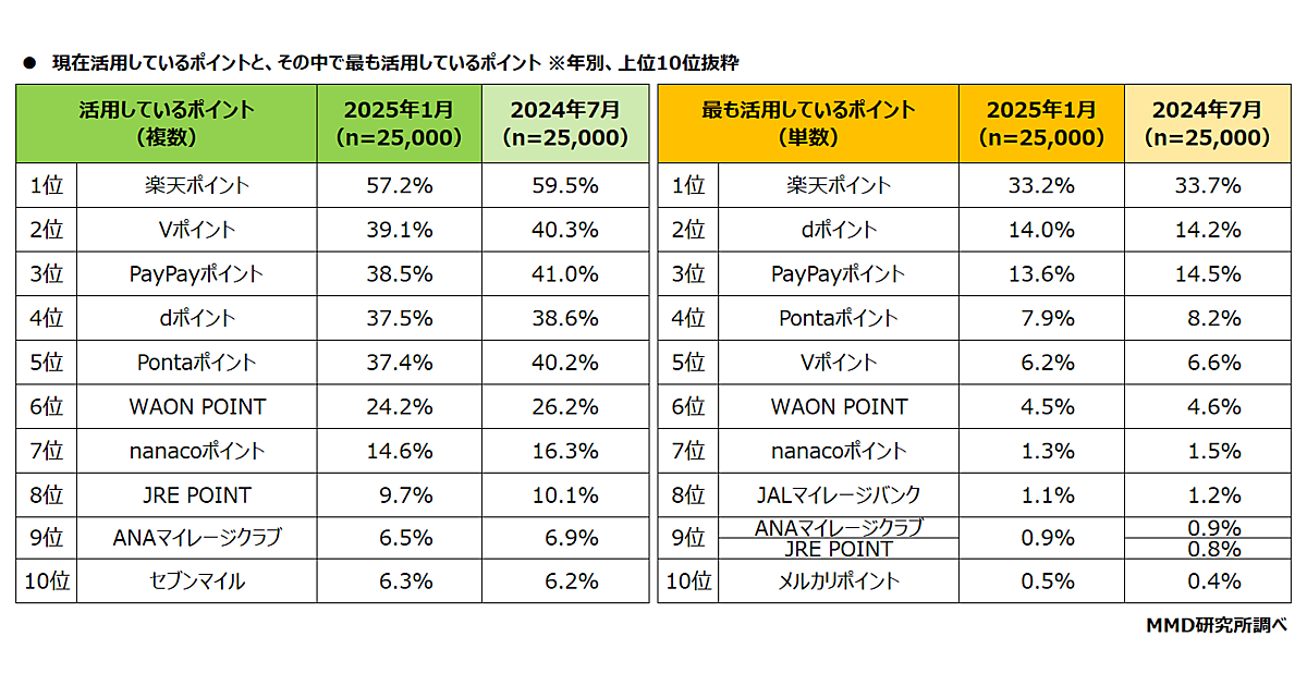 MMDLaboが運営するMMD研究所は、「2025年1月ポイント経済圏のサービス利用」に関する調査結果を発表した。予備調査では18歳~69歳の男女25,000人、本調査ではポイント経済圏メイン利用者2,500人が回答している。