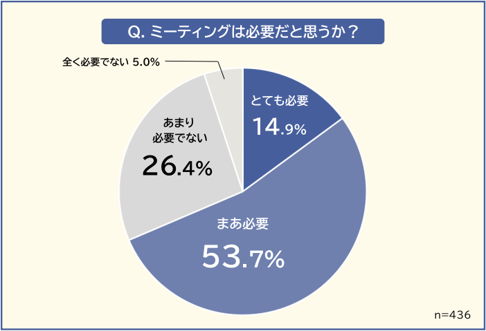 あらためて「ミーティングは必要だと思うか」と聞くと、「とても必要+まあ必要」が計68.6%。一方で、残る31.4%が不必要と考えていることもわかる。