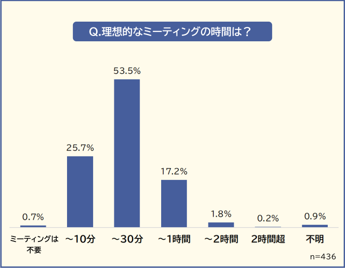なお「理想的なミーティングの時間」については、「かかる時間は案件にもよる」という声も複数あるが、平均27.7分。過半数が30分以内を選んでいた。