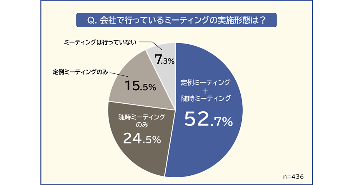 まず「会社で行っているミーティングの実施形態」を聞くと、「定例ミーティング」と必要に応じて行う「随時ミーティング」について、「両方している」52.7%が半数を超えたが、「随時ミーティングのみ」24.5%、「定例ミーティングのみ」15.5%、「ミーティングは行っていない」7.3%なども存在した。