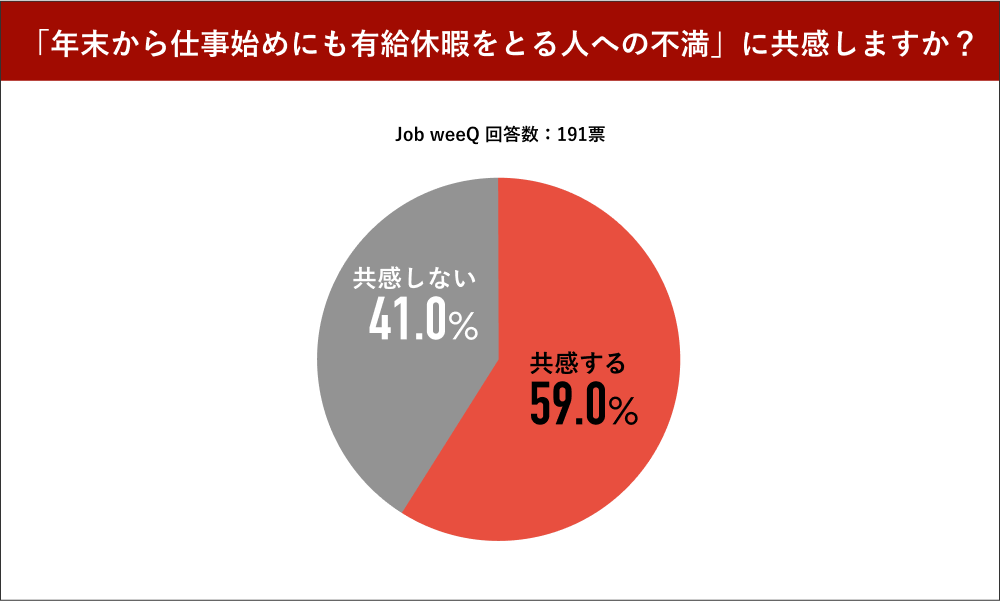 また「年末から仕事始めにも有給休暇をとる人に不満を覚えた」をいう意見には「共感する」59.0%、「共感しない」41.0%と、やや賛否が分かれたものの不満を感じる人のほうが多いようだ。土日のタイミングなどカレンダー次第だが、有給休暇を合わせるのも悩ましいところだ。