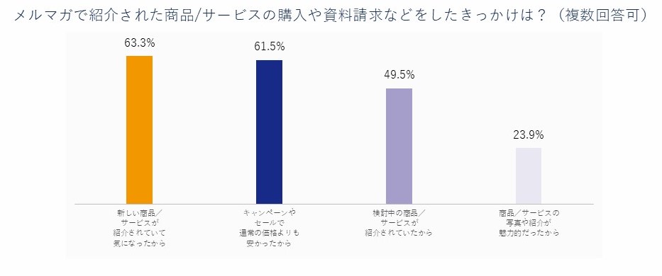 購入や資料請求のきっかけになったメルマガを聞いたところ、「新商品・サービスの紹介」が63.3%、「キャンペーン・セール」が61.5%と高かった。