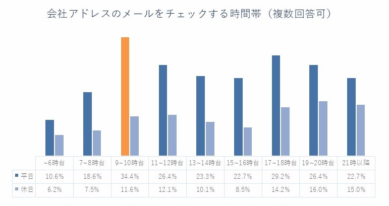 また、会社用アドレスのメール確認時間は「平日9~10時台」が最多の34.4%で、前年比+7.4ポイントと増加。リモートワーク縮小の影響が考えられる。