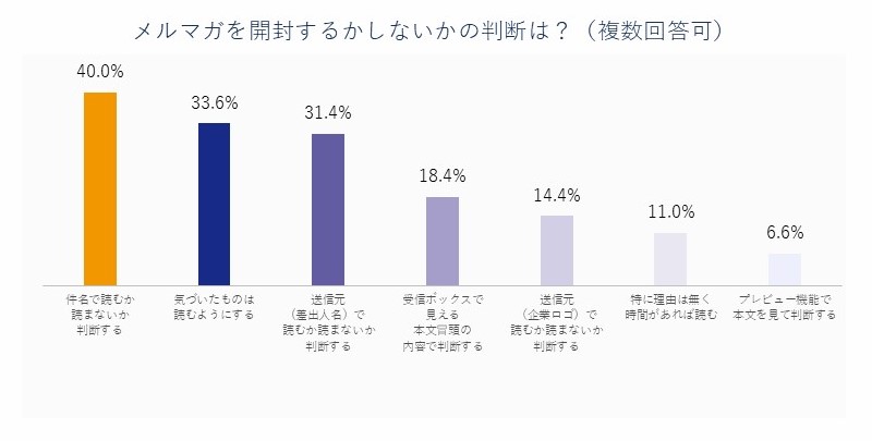 開封判断は「件名で決める」が40.0%で最多。「気づいたものは読む」が33.6%となり、件名の工夫や配信頻度の最適化が重要となる。