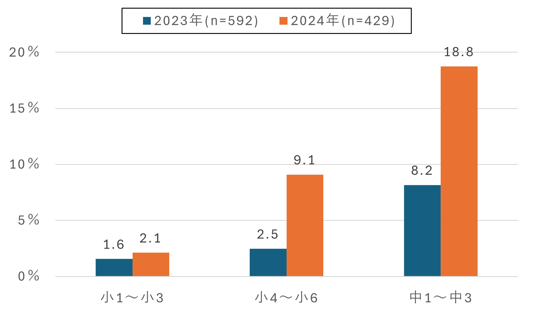 生成AIの利用率を2023年と比較すると、中学生では10ポイント以上増加し、小4~小6でも6ポイント以上増加した。