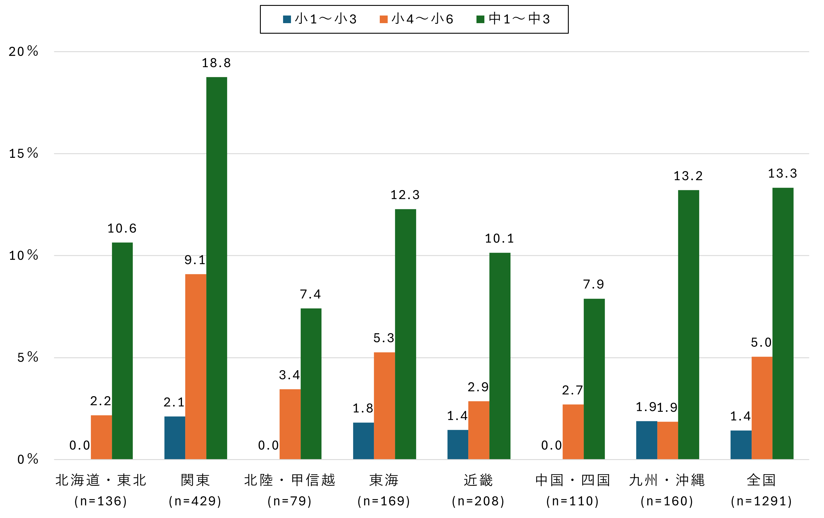 なお、地域別の生成AI利用率を見ると、関東が小中学生のどの年代でも利用率が高く、小1~小3は2.1%、小4~小6は9.1%、中学生は18.8%だった。次いで、中学生では九州・沖縄が13.2%、小4~小6では東海が5.3%、小1~小3では九州・沖縄が1.9%だった。