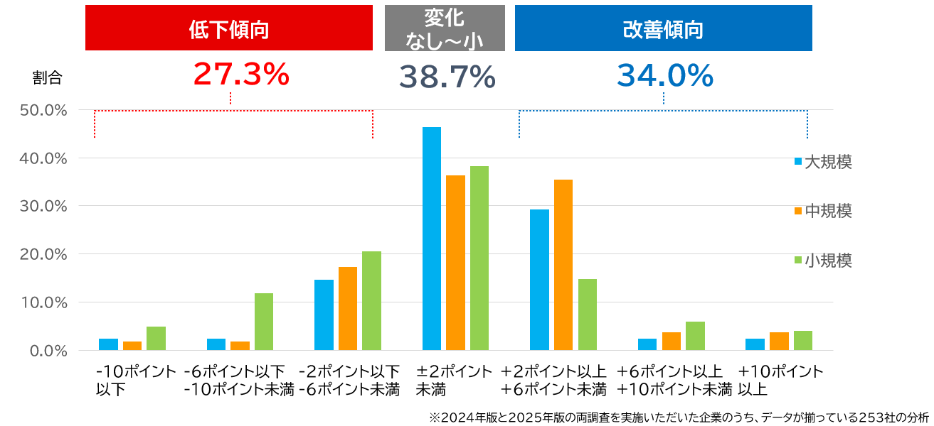 2か年連続(2024年・2025年)で参加した企業について、低下幅が2pt以上=低下傾向、改善幅2pt以上=改善傾向、それ以外の企業=変化なし~小として分類したところ、全体としては「変化なし~小」がもっとも多く、7割以上の企業の働きがいが維持または改善しており、2024年は好調な年であったという。