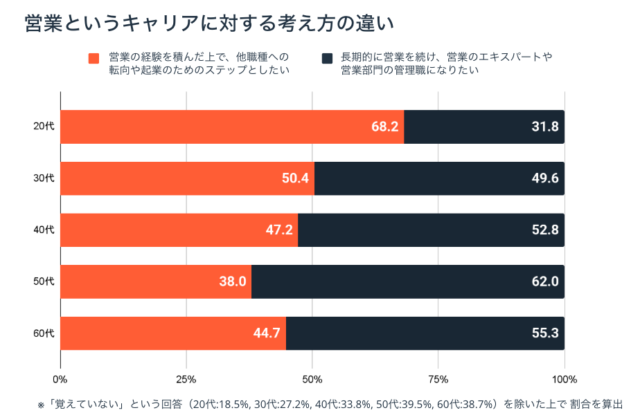 20代の68.2%が「他職種への転向や起業のためのステップとしたい」と回答し、30代以上の各世代においては約半数または半数以上が「営業のエキスパートや営業部門の管理職になりたい」と回答する結果となった。
