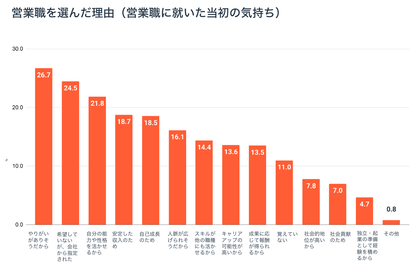 「営業を選んだ理由」を聞いたところ、「やりがいがありそうだから」(26.7%) が最も多く、続いて 「希望していないが会社から指定された」(24.5%) だった。