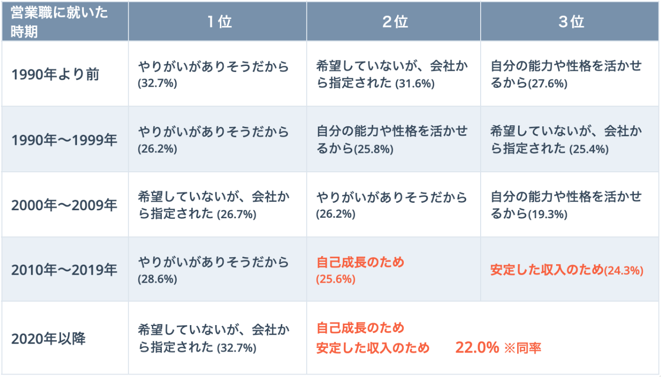 営業職に就いた時期を「1990年より前」「1990~1999年」「2000~2009年」「2010~2019年」「2020年以降」の5つに分け、それぞれ「営業を選んだ理由」の上位3項目を比較した。