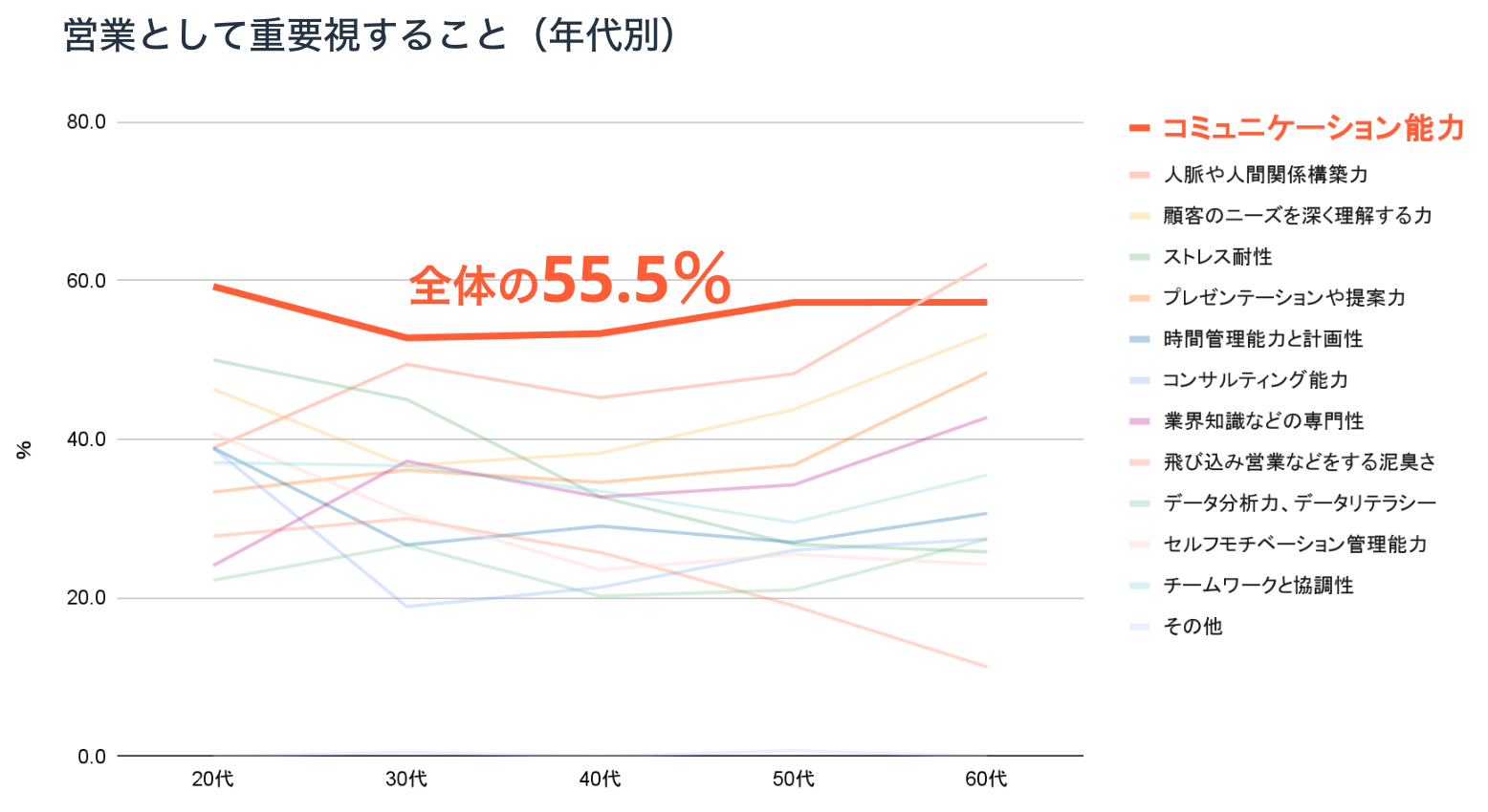 営業で重要視するスキルは、全体では「コミュニケーション能力」(55.5%)だった。20代~50代では最も重要視されるスキルだったが、60代では人脈や人間関係構築力が最も重要視されるスキルだった。