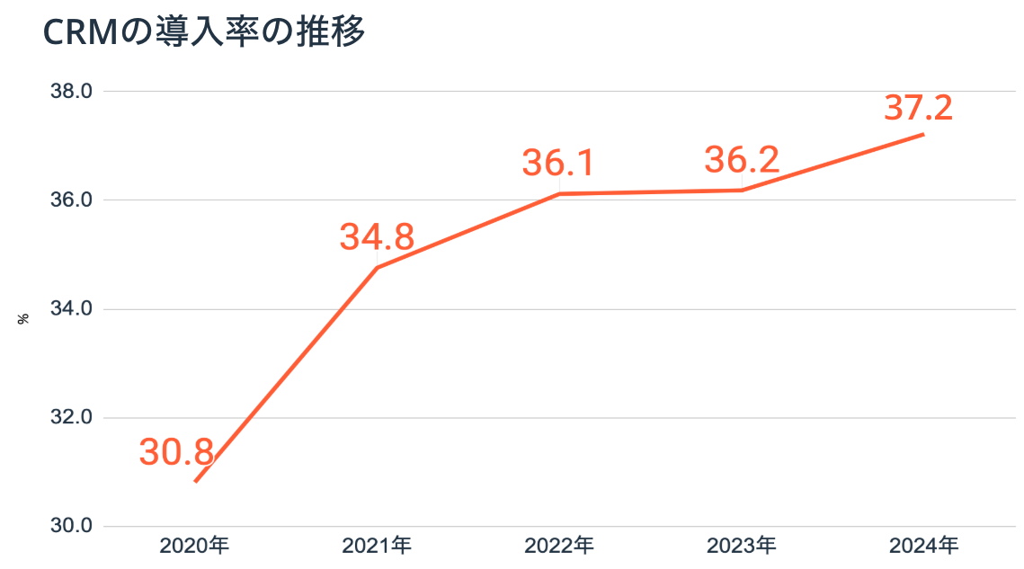 CRMの導入率を聞いたところ、2020年から導入率は緩やかに増加しており、2024年は37.2%で昨年から1ポイント増加した。