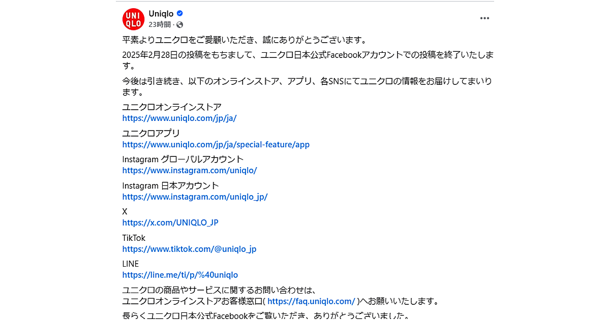ユニクロは、2025年2月28日の投稿をもって、日本公式Facebookアカウントでの投稿を終了することをFacebookの公式アカウント上で発表した。2010年9月3日の開設以来、約14年間にわたり運営されてきた同アカウントでの情報発信が終了する。