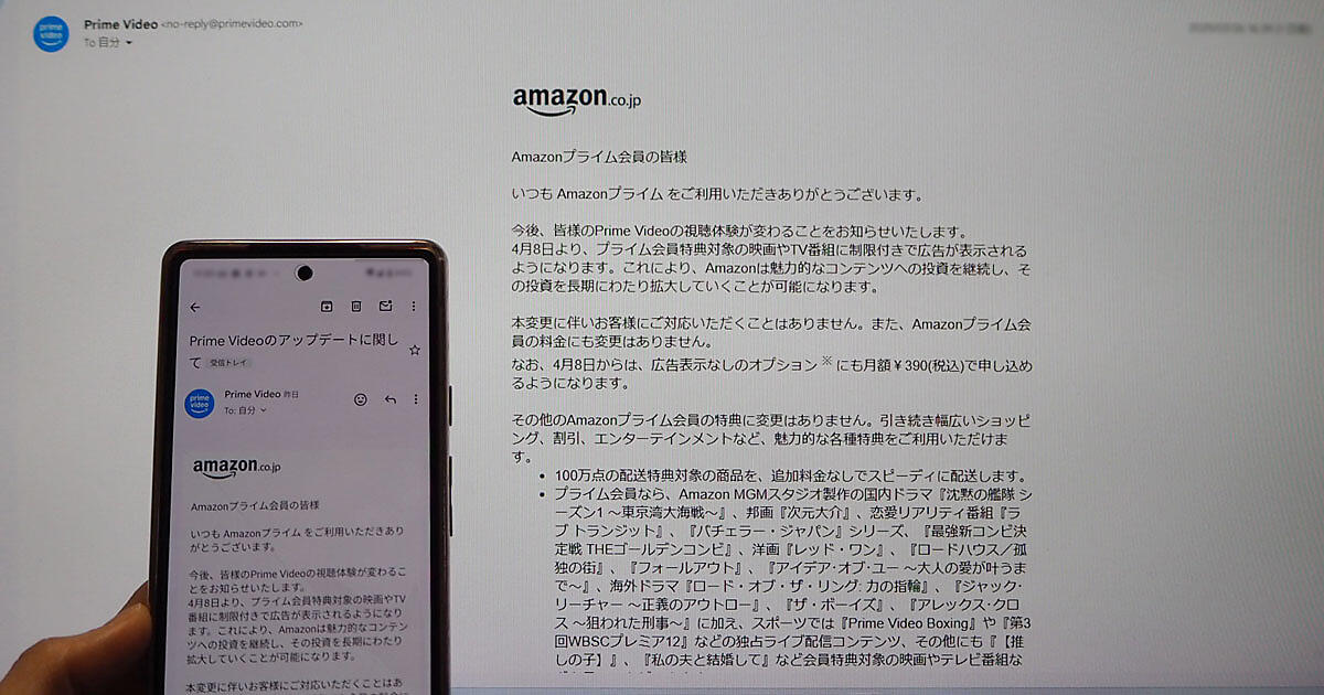 「Prime Videoのアップデートに関して」の件名で会員に送った2月26日付メールで明らかにした。「Amazonは魅力的なコンテンツへの投資を継続し、その投資を長期にわたり拡大していくことが可能になります」と広告表示の理由を説明している。動画配信での広告表示以外で「Amazonプライム会員」の特典に変更はなく、商品の配送料無料や会員限定セール、音楽配信、写真保存の容量無制限などを引き続き利用できる。