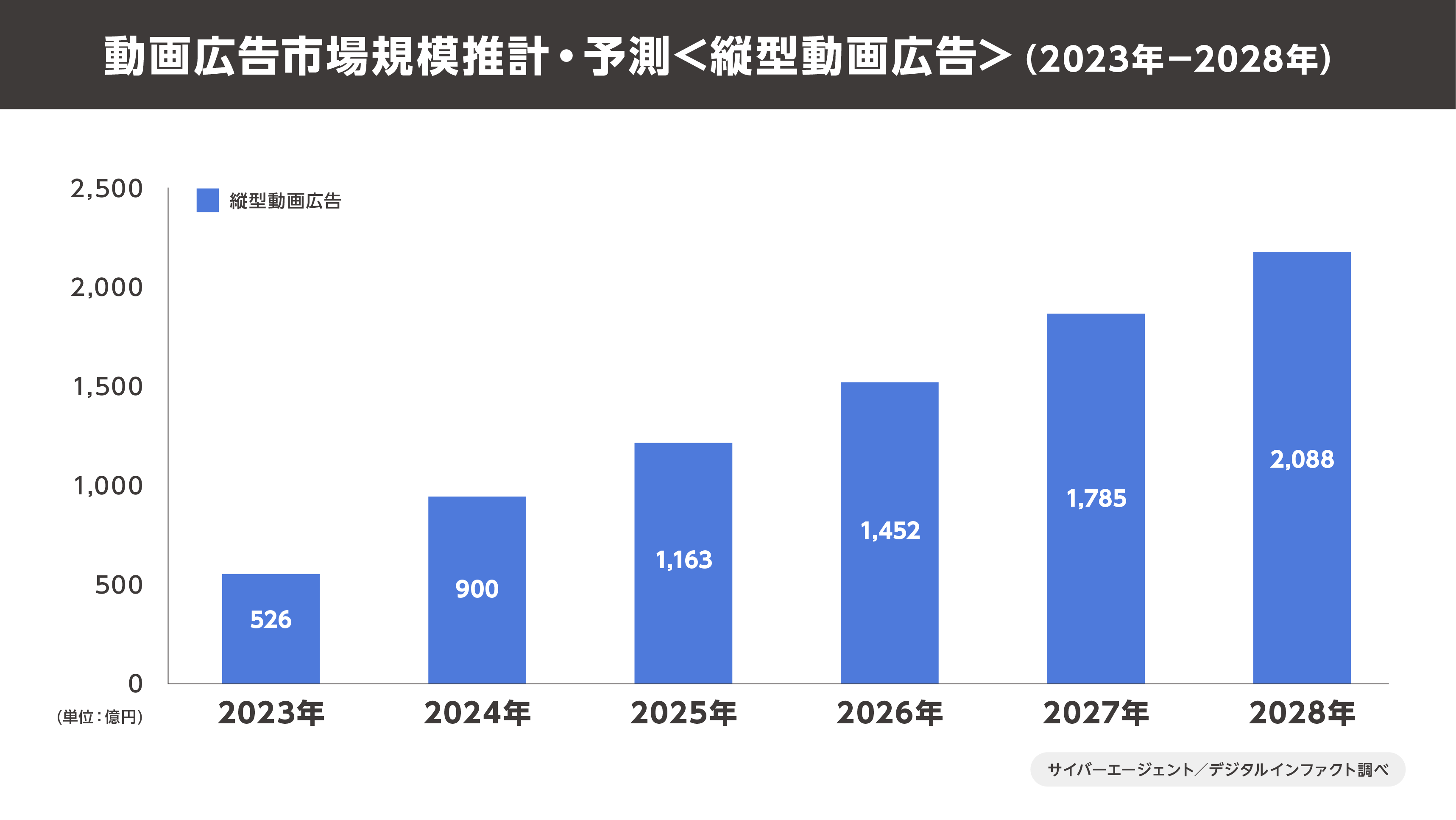 動画広告市場のなかで、縦型動画広告に絞って市場規模を見ると、2024年の縦型動画広告の市場規模は昨年対比171.1%、900億円に達した。2028年の市場規模は2088億円に達する見込み。