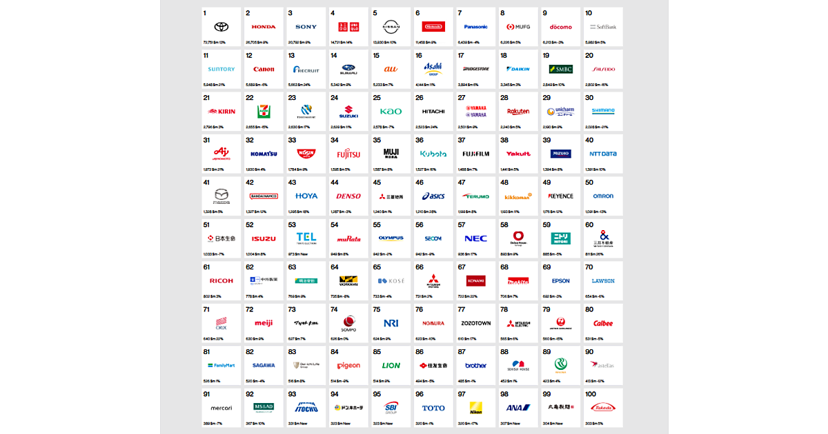 76位~100位では、93位にITOCHU(伊藤忠商事)、94位にDon Quijote(ドン・キホーテ)、95位にSBI(SBIホールディングス)、98位にANA(全日本空輸)、99位にMarugame Seimen(丸亀製麺)の5社が初ランクインした。