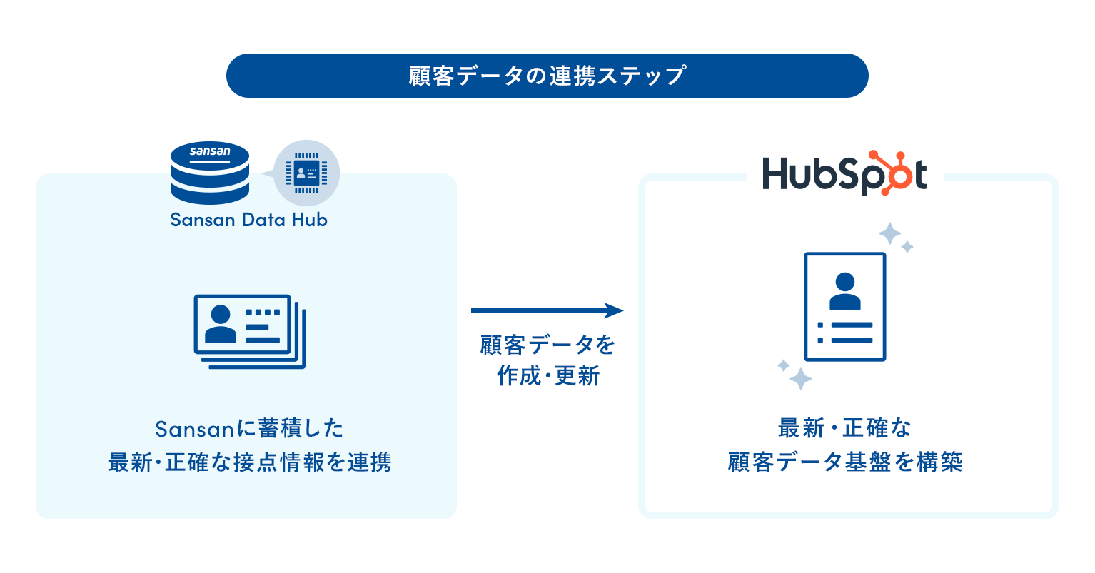 サービスのSansanは、名刺やメールでの接点から得られる情報をデータ化し、全社で共有可能にするデータベースを構築することで、ビジネス機会を最大化する。プラットフォームのHubSpotはMA(マーケティングオートメーション)・CRMを搭載する。連携によって、Sansanのデータを基に企業名、氏名、役職、連絡先といった項目がHubSpotで自動的に作成・更新される。