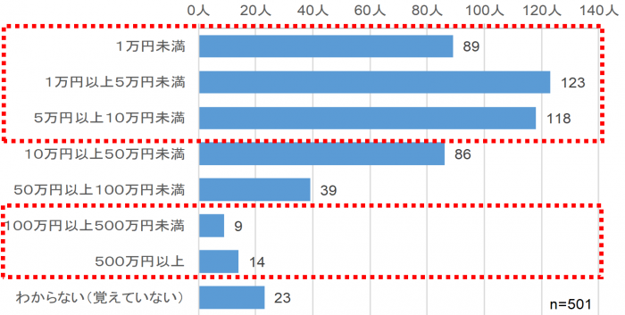 「被害金額」を被害者501人に聞くと、もっとも回答が多かったのは「1万円以上5万円未満」123人。「10万円未満」の合計は計330人で、全体の半数以上を占めた。一方で「100万円以上」の被害者も23人存在。そのうち「500万円以上」が14人とかなりの人数だ。