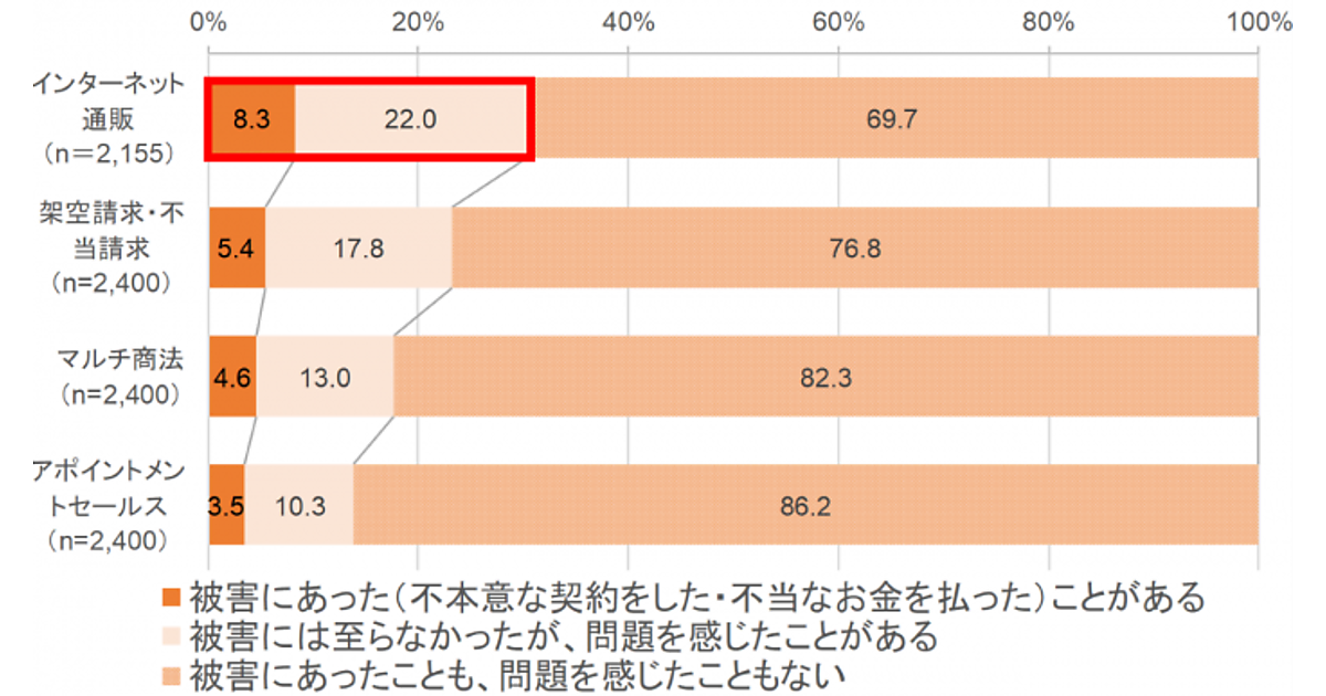 まず「消費者被害の経験の有無」を聞くと、「被害にあったことがある(不本意な契約をした・不当なお金を払った)」がもっとも多かったのは、「インターネット通販」8.3%。以下「架空請求・不当請求」5.4%、「マルチ商法」4.6%、「アポイントメントセールス」3.5%の順で続いた。「インターネット通販」は「被害には至らなかったが、問題を感じたことがある」22.0%も最多で、計30.3%の若者がトラブルに遭遇している。
