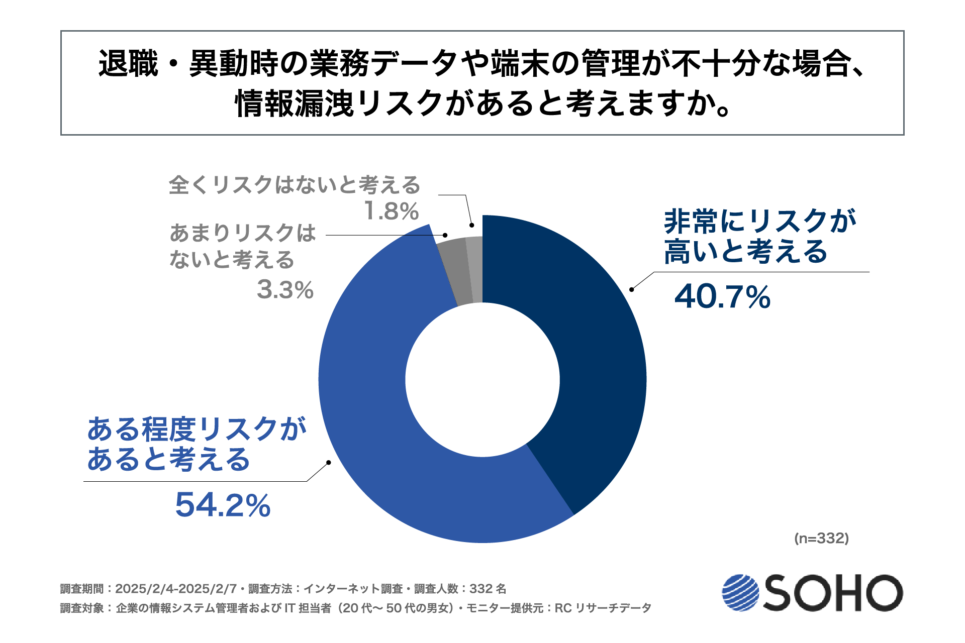 また「退職・異動時の業務データや端末の管理が不十分な場合、情報漏えいリスクがあると考えるか」についても、「ある程度リスクがあると考える」54.2%、「非常にリスクが高いと考える」40.7%と、9割超が情報漏えいリスクを感じている。