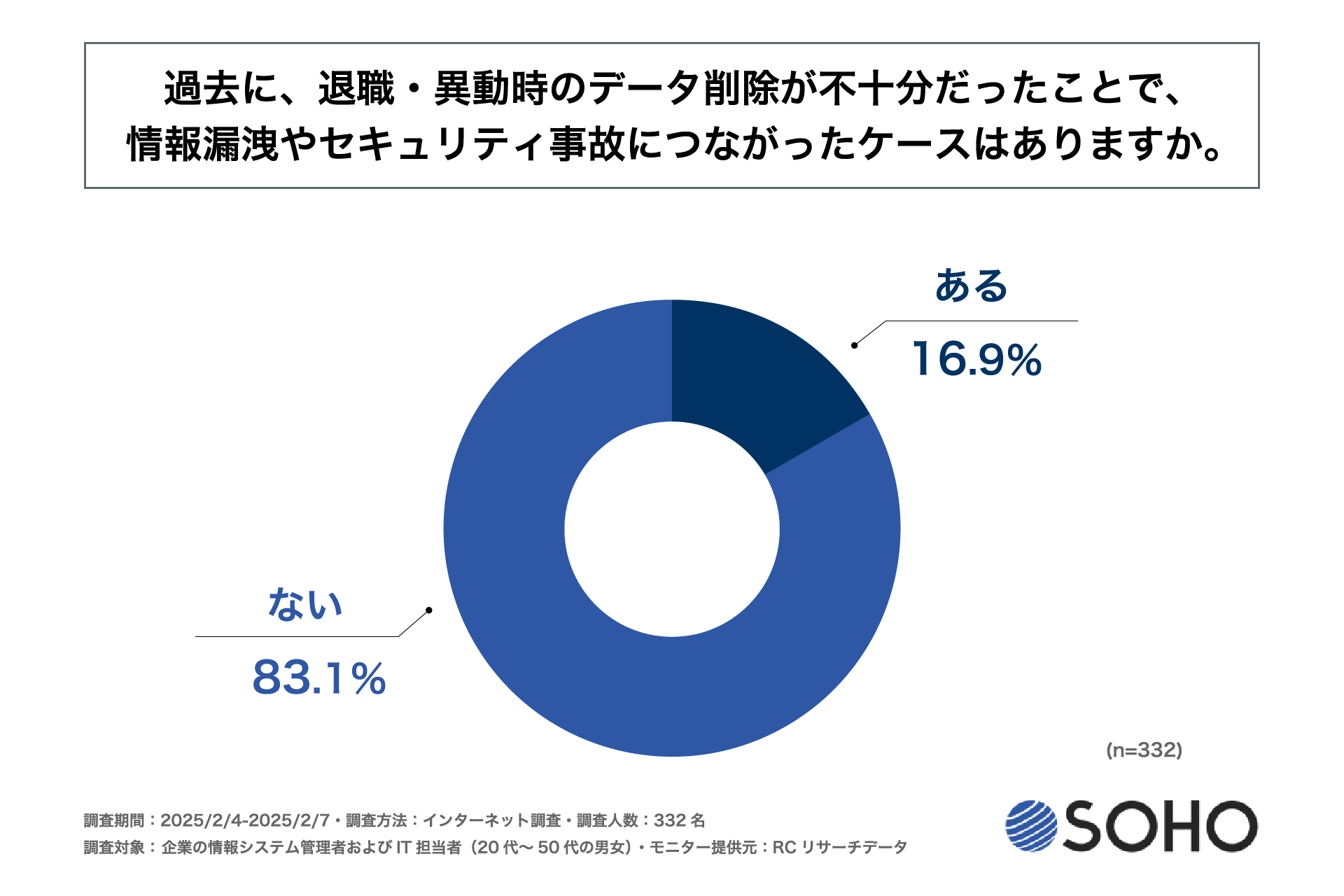 一方で、「退職・異動時のデータ管理・削除に関する明確なルールやガイドラインを設けているか」については、「設けている」67.2%、「設けていない」32.8%で、3割超が放置状態。さらに「過去に、退職・異動時のデータ削除が不十分だったことで、情報漏えいやセキュリティ事故につながったケースはあるか」では、「ある」16.9%と、2割近い企業が退職・異動時のデータ削除が不十分だったことで、情報漏えいやセキュリティ事故につながっていた。