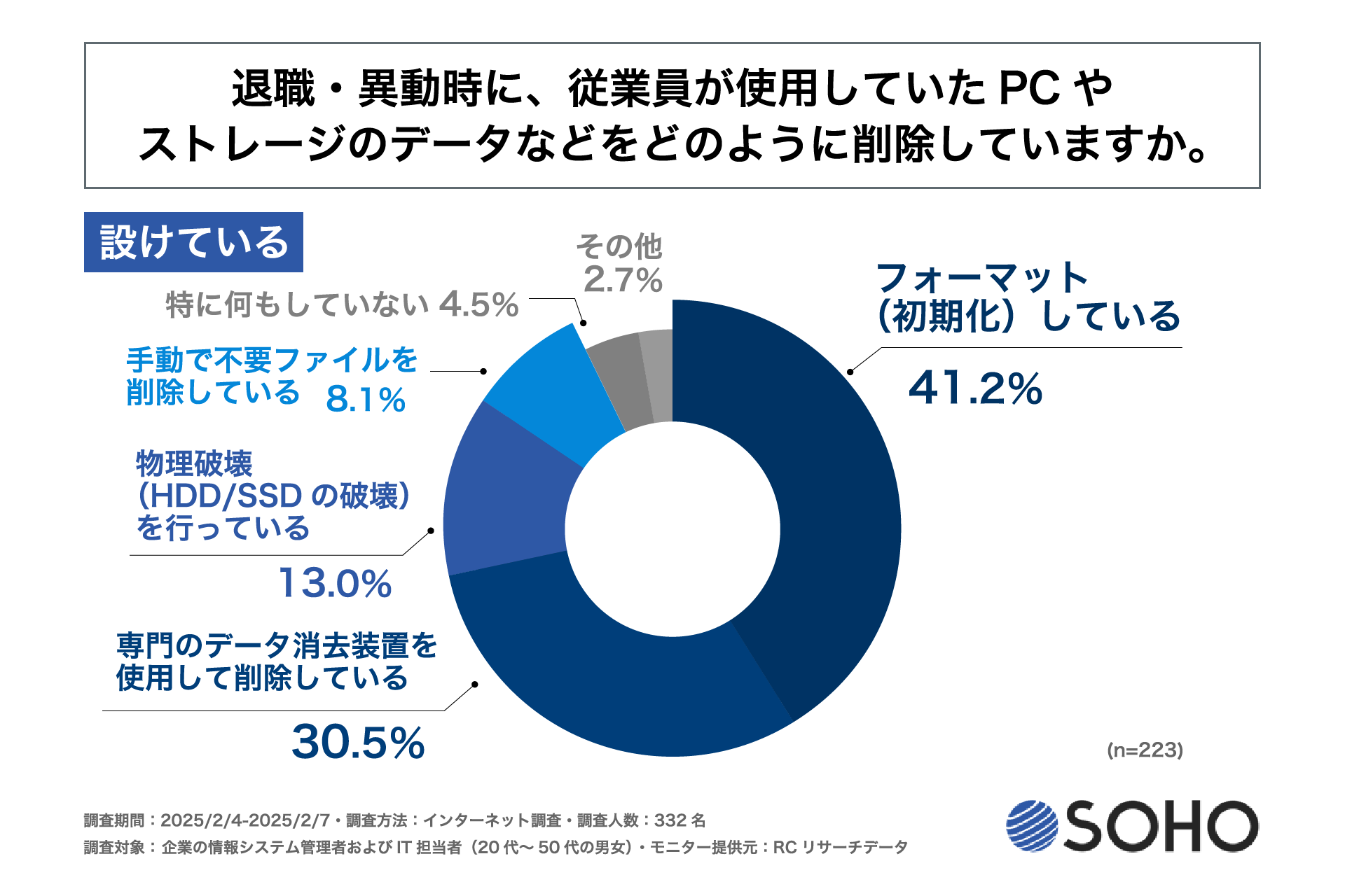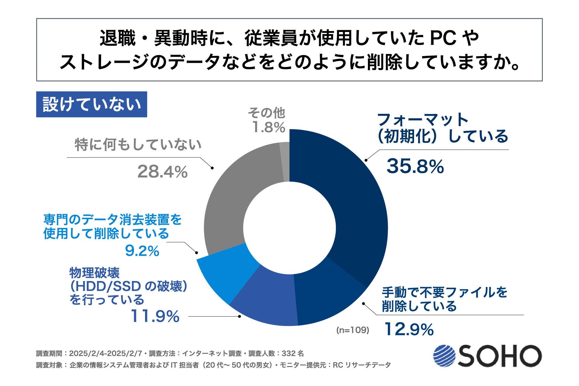 さらに、「退職・異動時に、従業員が使用していたPCやストレージのデータなどをどのように削除しているか」を聞くと、ルールやガイドラインを設けている企業/ルールやガイドラインを設けていない企業ともに、1位は「フォーマット(初期化)している」だった。