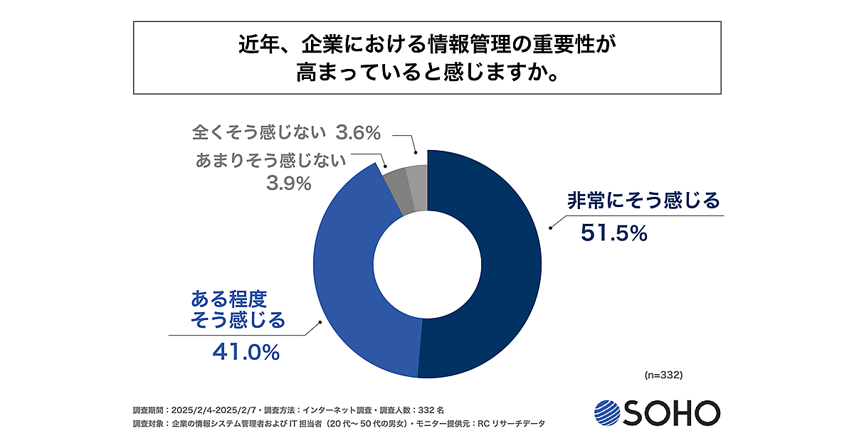 まず、「近年、企業における情報管理の重要性が高まっていると感じるか」を聞くと、「非常にそう感じる」51.5%、「ある程度そう感じる」41.0が上位で、9割超の企業が情報管理の重要性を感じていた。