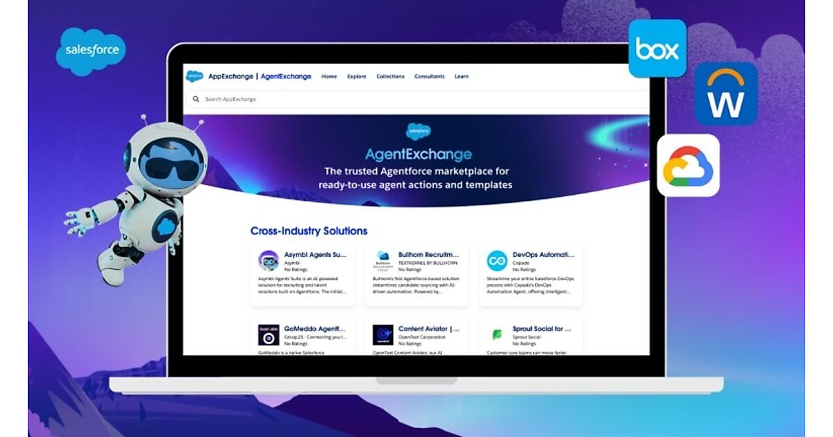 AgentExchangeは、厳しいセキュリティと顧客レビューを通った200社以上の初期パートナーと、数百の作成済みアクション、トピック、テンプレートで開始。最適なソリューションを組み合わせることで、さまざまな業種の企業が生産性を高められるAIエージェントが素早く作成・展開できる。セールス、サービス、財務、オペレーション、人材などのソリューションがある。