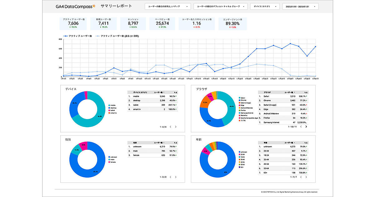 クリエイティブやWebサイトの企画・制作・運営のプリ・テックは、Googleの行動分析ツール「Google Analytics 4(GA4)」のレポート作成を自動化するツール「GA4データコンパス」の提供を始めたと3月10日に発表した。データ分析に悩む中小企業のマーケティング担当者やWeb担当者が専門知識がなくても直感的に操作でき、毎月のレポート作成時間を70%以上削減してデータ分析に本来使うべき時間を確保できる。