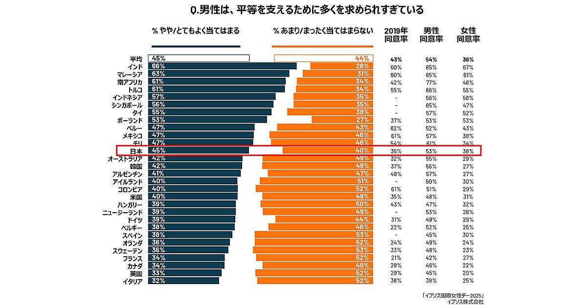 「男性は、平等を支えるために多くを求められすぎている」に「やや/とてもよく当てはまる」と回答した日本人は45%で、2019年の調査から6年間で10ポイント増加した。特に男性の同意率が高く、男性53%、女性38%と、女性の約1.4倍の男性が同意していた。