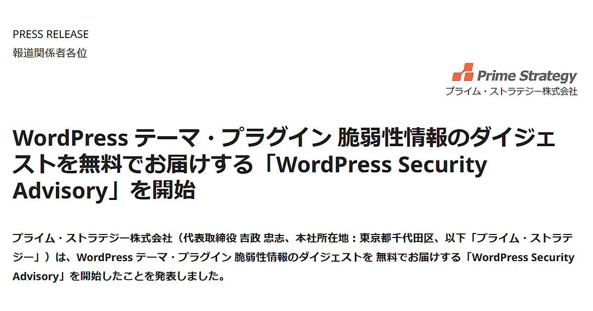 プライム・ストラテジーは、WordPressのテーマ・プラグインに関する脆弱性情報を日本語で提供する「WordPress Security Advisory」の配信を開始した。