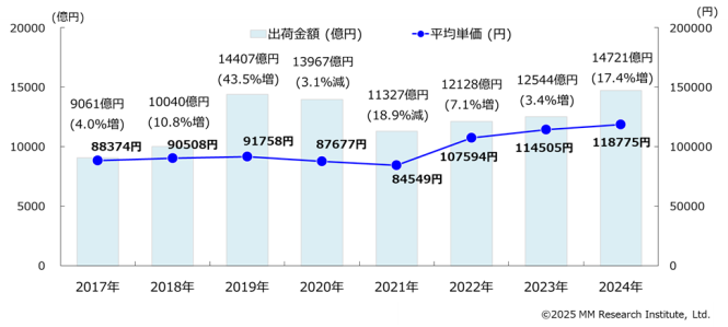 この調査によると、2024年の国内パソコン出荷台数は「1239.4万台」で前年比13.1%増。2020年以来4年ぶりの増加だった。出荷金額は前年比17.4%増の「1兆4721億円」。平均出荷単価は「11万8775円」で2年連続で単価が11万円を上回った。