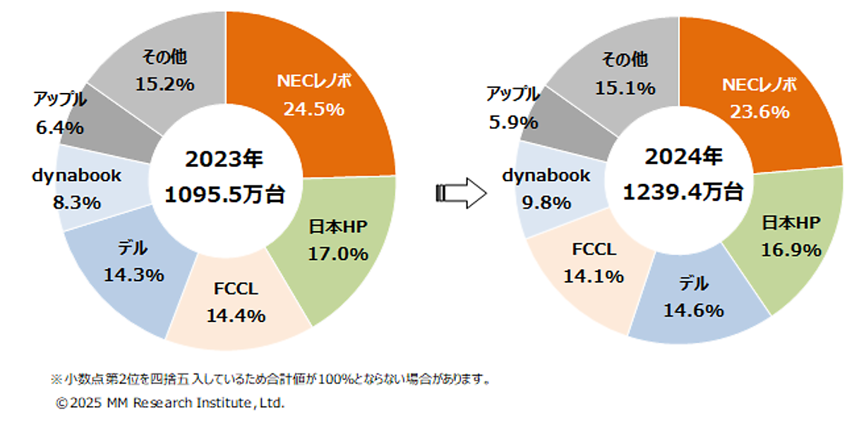 MM総研(MMRI)は、「2024年 国内パソコン出荷台数」に関する調査結果を発表した。2024年(2024年1~12月)の国内パソコン出荷台数を集計している。