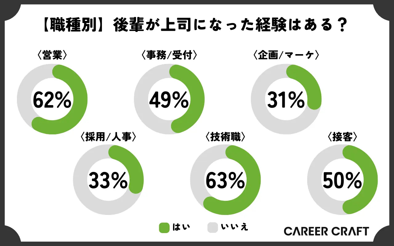 職種別に後輩上司を持った経験の有無を見ると、「営業」「技術職」は、60%以上が後輩が上司になった経験があると回答した。一方、「企画/マーケ」「採用/人事」は、約30%と他職種より低くなった。
