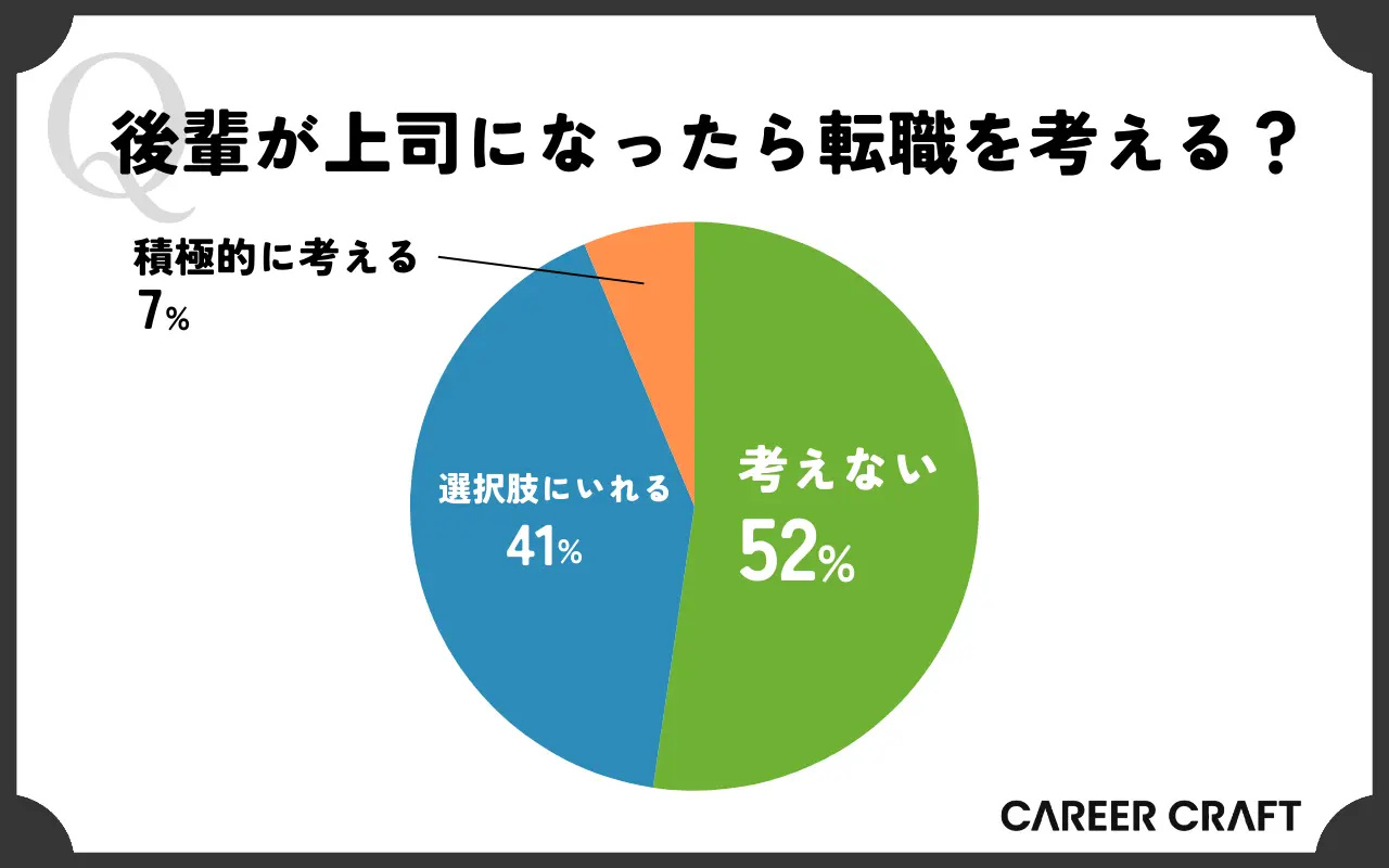 後輩が上司になったら転職を考えるか、と聞いたところ「考えない」人は52%(157人)だった。一方「選択肢にいれる」も41%(124人)となっており、後輩の昇進が転職に影響を与える要因であることがわかる。