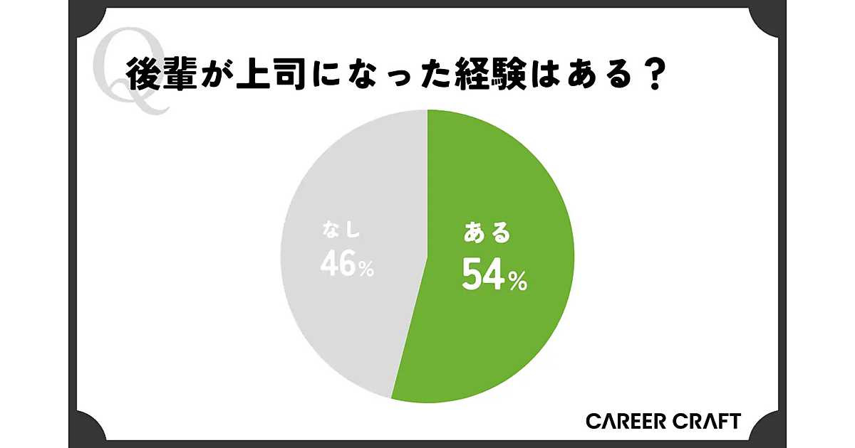 後輩が上司になった経験が「ある」と答えた人は54%(163人)だった。