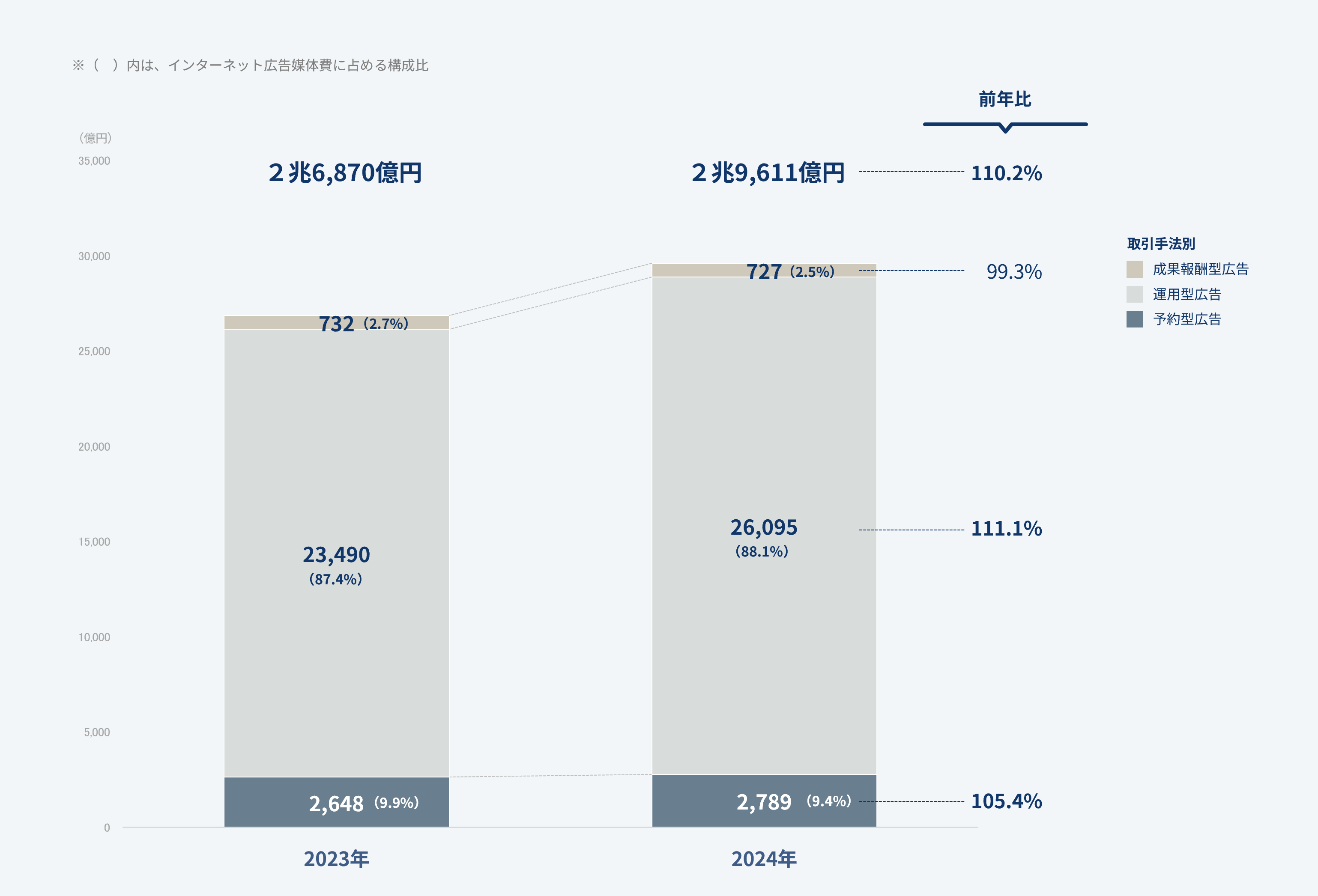 - 運用型広告:検索連動型広告、およびデジタル・プラットフォーム(ツール)やアドネットワークを通じて入札方式で取引されるもの