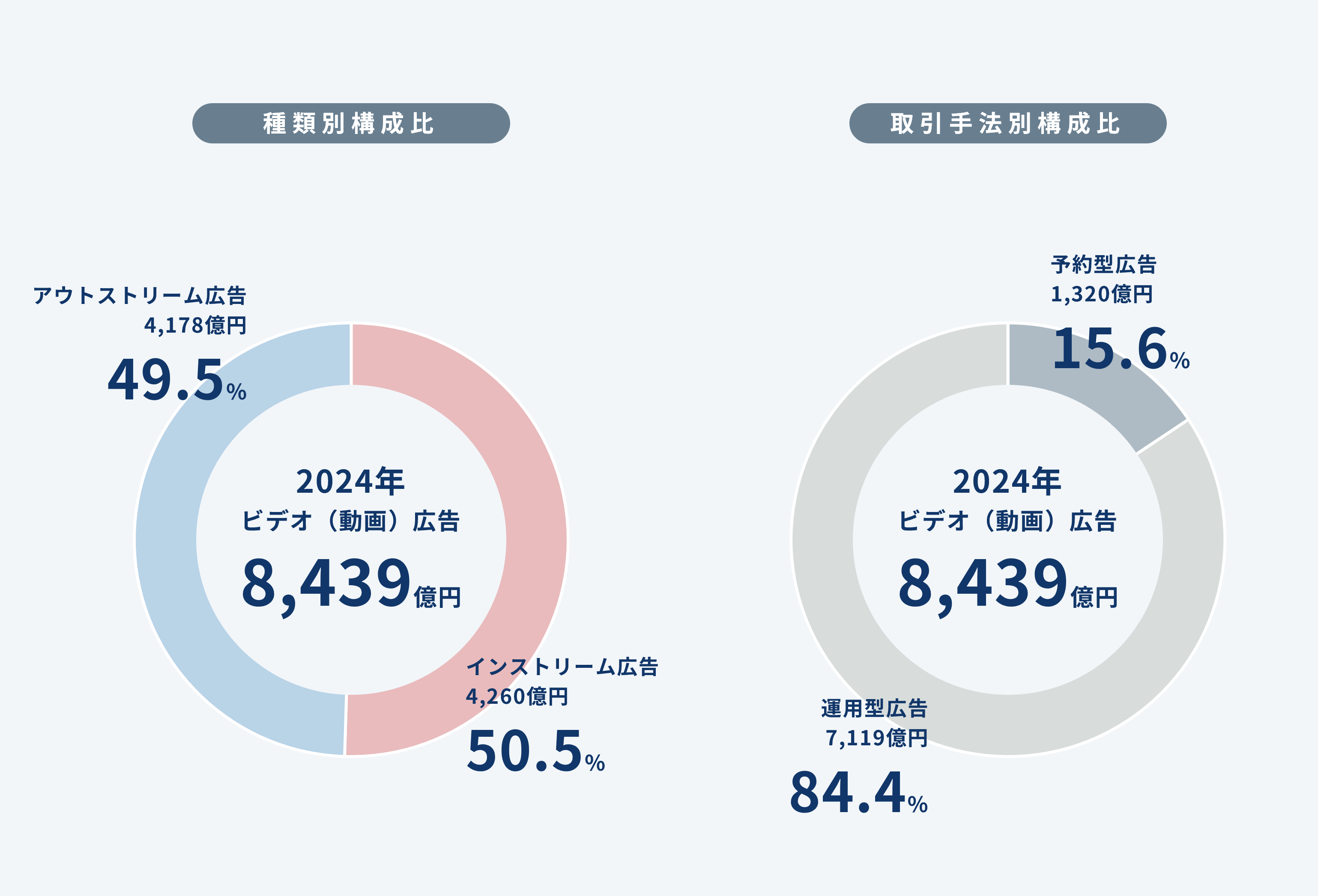 ビデオ(動画)広告は、前年比123.0%の8,439億円と、広告種別で最も高い成長率となった。その内訳は、動画コンテンツの間に挿入されるインストリーム広告が4,260億円(構成比50.5%)、Webサイト上の広告枠や記事のコンテンツ面などで表示されるアウトストリーム広告が4,178億円(構成比49.5%)となり、ほぼ同水準であった。また、取引手法別では運用型広告が84.4%を占めた。